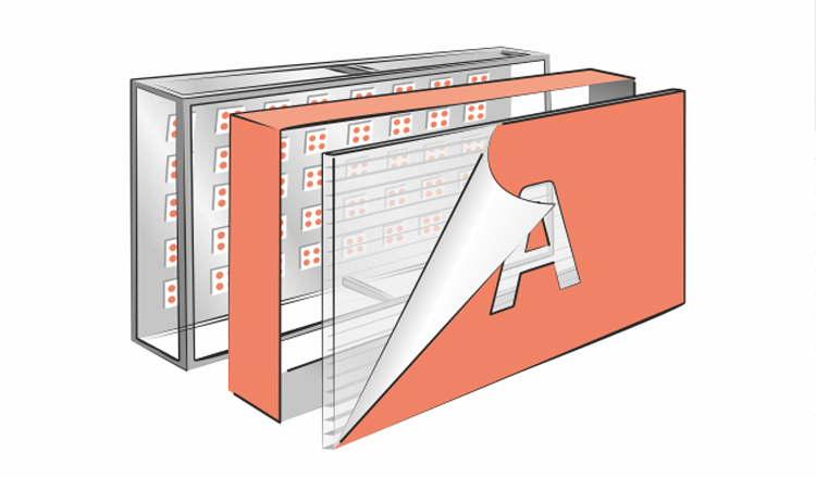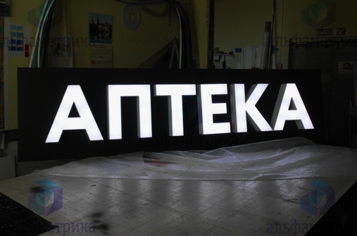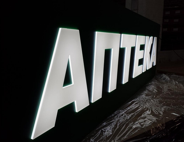 Объемные буквы. Изготавливаются из ПВХ пластика, оргстекла, жидкого акрила, нержавеющей стали. Могут иметь лицевую, заднюю и комбинированную подсветку из светодиодов. Также пластиковые буквы подсвечивают открытыми пикселями либо вообще оставляют без подсветки. Металлические буквы тоже можно оставить без подсветки. Объемные буквы устанавливают на подложку, раму или дистанционные держатели.