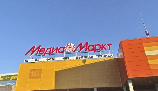 На встрече с клиентом уточнили размеры места установки (на крыше гипермаркета), бюджет, требования к типу и дизайну объемных букв на крышу. Дизайнеры предложили несколько вариантов, и клиент выбрал крышные буквы из алюминиевого профиля, акрила и пластика с лицевой подсветкой. Буквы высотой 3,7 метра, общая длина вывески — около 11 метров. При помощи 3D-макета определились с нужным шрифтом, буквы покрыты эмалью.