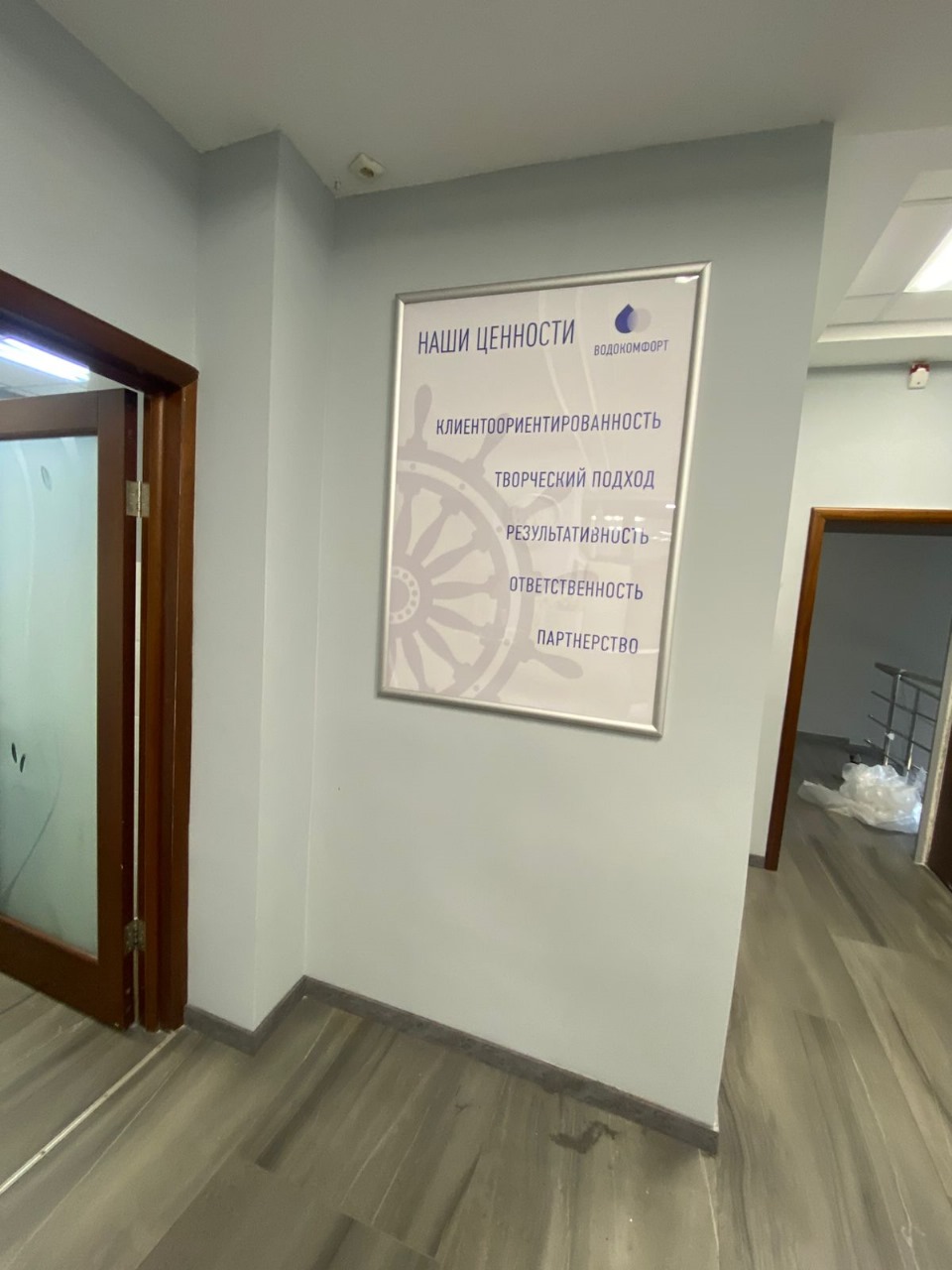Подсветка реализована при помощи светодиодной ленты 12 В, расположенной внутри корпуса по периметру. Такое решение обеспечивает равномерное свечение, чётко выделяет надписи и делает короб хорошо заметным с улицы как днём, так и вечером.