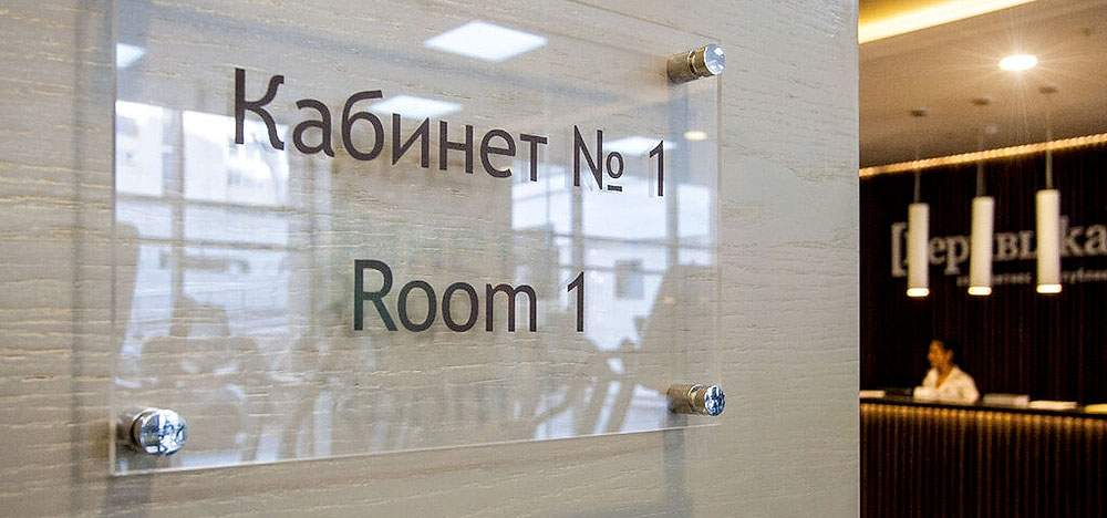 Для проекта были оформлены таблички из стекла размером 500х600 мм. Для создания таблички из стекла с УФ печатью используется прозрачная стеклянная основа, на которую наносится изображение. В данном случае табличка выполнена из стекла и содержит текст «Кабинет №1» и «Room 1», что делает её универсальной для использования как в русскоязычной, так и в англоязычной среде. Такой дизайн подчёркивает профессионализм и стиль, а также обеспечивает удобство восприятия информации.