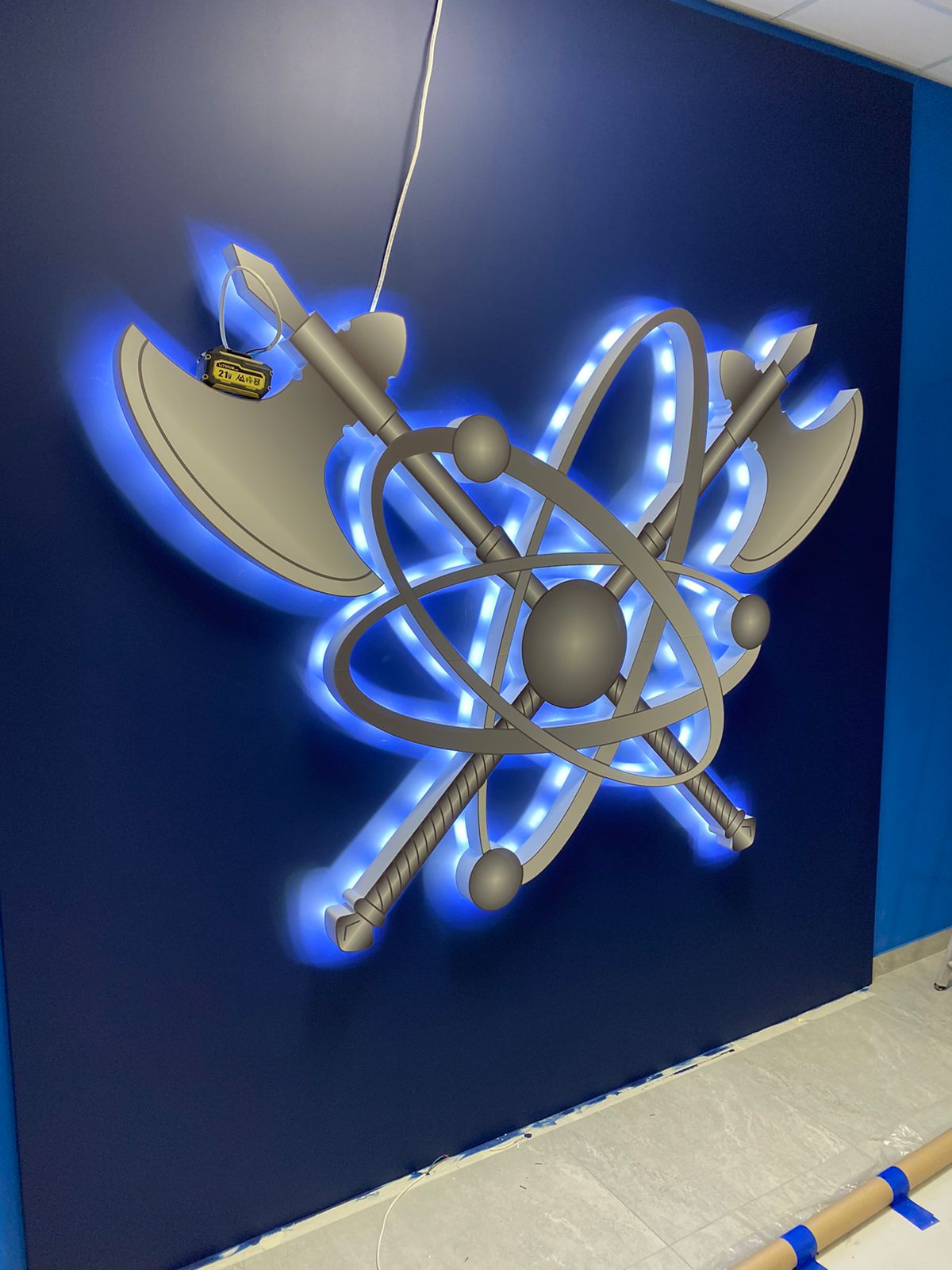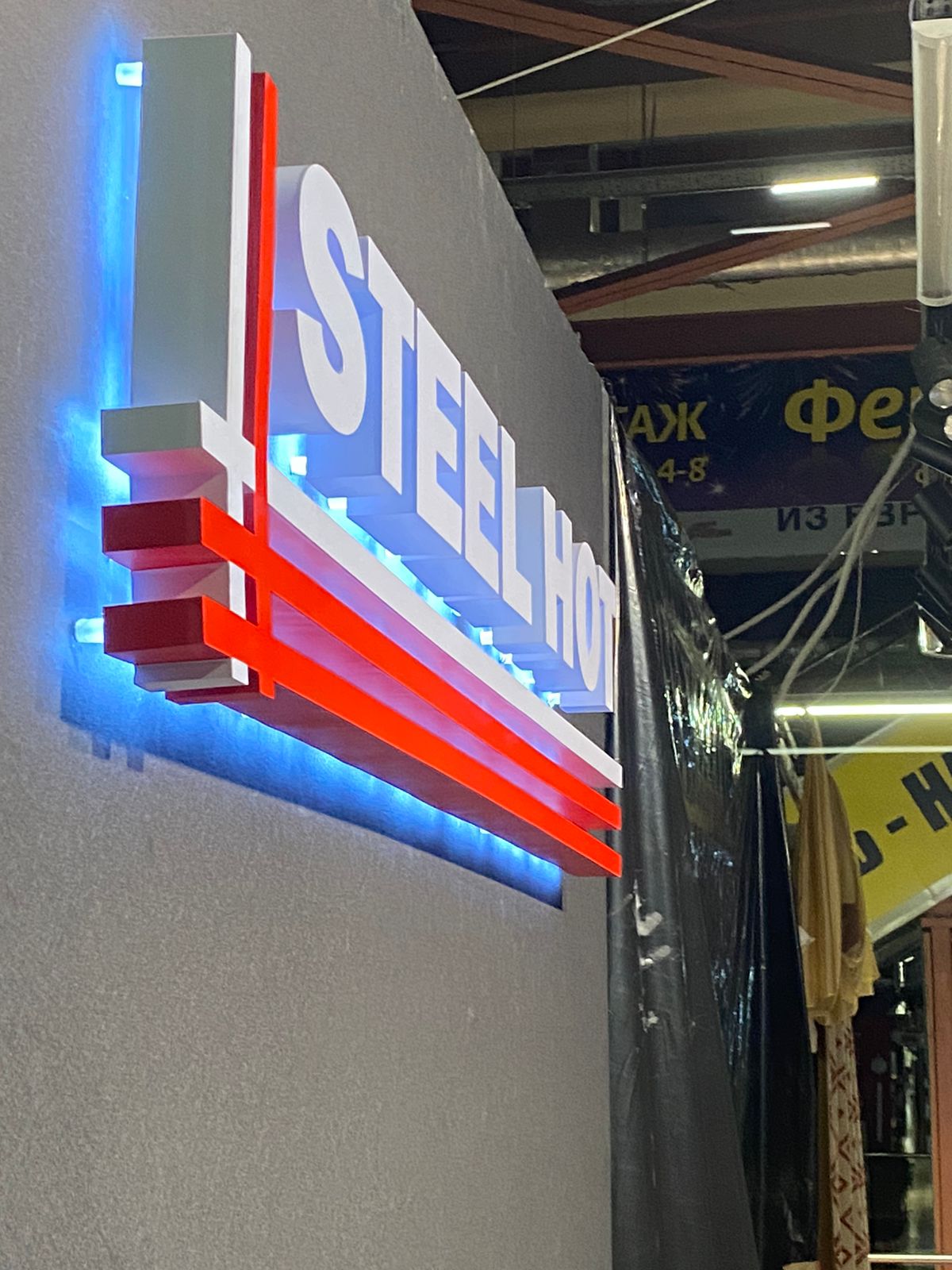 Материалы. Логотип на стену изготавливается из ПВХ пластика (300 до 2000 руб/м²), нержавеющей стали (4500 до 5000 руб/м²) или алюминия (2000 до 2300 руб/м²), акрилового стекла PLEXIGLAS (3000-5000 руб/м²). Для подсветки нужны светодиоды со стандартом защиты IP65-67 (500–3000 руб/м) и блок питания (500-1500 руб/шт). Стоимость резки и формовки элементов вывески составит около 3000 рублей, а сборка и монтаж подсветки — около 4000 рублей.